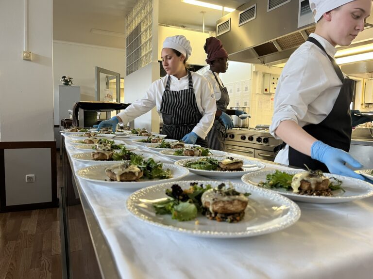 O jantar incluiu entradas de cogumelos recheados com queijo de ovelha e azeite de trufa, seguidas de uma reconfortante sopa de couve lombarda com cenoura. No prato de peixe brilhou um clássico bacalhau à Brás, enquanto o prato de carne trouxe à mesa uma coxa de pato confitada acompanhada de risoto de enchidos. Para sobremesa, um pastel de nata reinventado com massa filo e gelado de café fechou a experiência com chave de ouro. Todos os momentos foram harmonizados com vinhos das Caves Aliança, parceira habitual da escola.