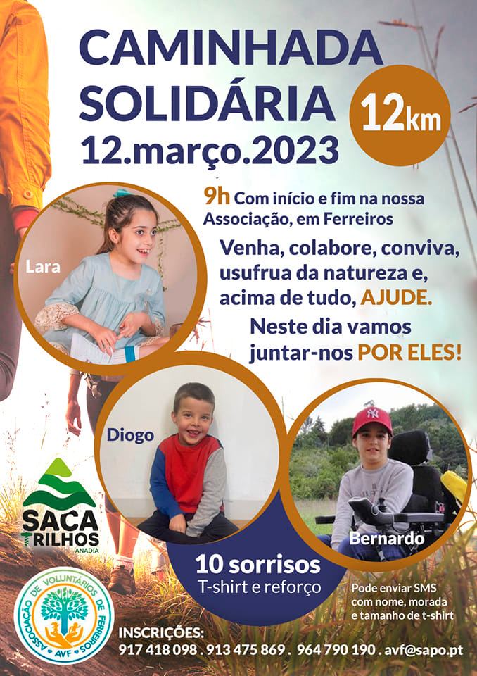 A Associação de Voluntários de Ferreiros promove, no próximo dia 12 de março, pelas 9h, uma caminhada solidária de 12km a favor da Lara, do Diogo e do Bernardo, crianças com necessidades especiais.