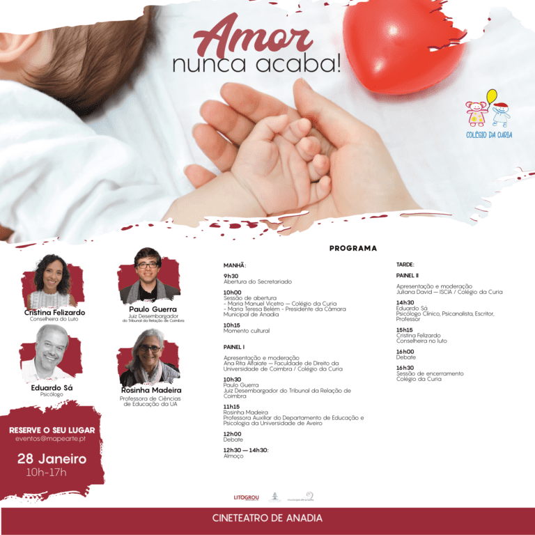 O Colégio da Curia promove, no Cineteatro de Anadia, no próximo dia 28 de janeiro, das 10h às 17h (programa em anexo), a Conferência “O Amor nunca acaba”.